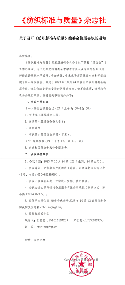 《紡織標準與質(zhì)量》第五屆編輯委員會(以下簡稱“編委會”)工作已屆滿,為了充分發(fā)揮編委會中學(xué)術(shù)帶頭人及專家的指導(dǎo)作用,聘請政治思想水平過硬、責(zé)任感強、學(xué)術(shù)水平高的優(yōu)秀專家和學(xué)者組建了新一屆編委會,茲定于2023年10月24日在北京召開編委會換屆會議。各有關(guān)單位有意參會請按通知報名,具體參會事項及參會回執(zhí)見附件。
