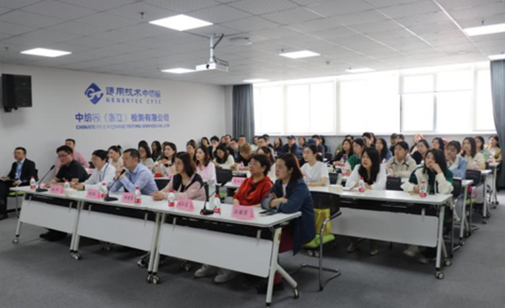 5月11日上午,通用技術浙江中紡標與雅瑩集團下屬雅瑩書院共同開展功能性紡織品研學活動。雅瑩集團面料開發、面料采購等相關部門共計53人參加了此次活動,浙江中紡標培訓老師做了關于功能性紡織品檢驗標準、實驗環境以及產品特性等相關知識培訓。浙江中紡標總經理助理胡凱通過現場講解,幫助學員更清晰的了解功能性相關檢測知識。