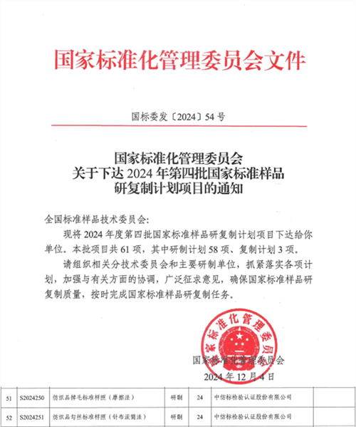 2024年12月4日,國家標準化管理委員會印發《關于下達2024年第四批國家標準樣品研復制計劃項目的通知》(國標委發[2024]54號),下達2024年度第四批國家標準樣品研復制計劃項目共61項,正式立項的2項紡織標準樣品計劃均由通用技術中紡院中紡標檢驗認證股份有限公司(以下簡稱“中紡標”)承擔研制。