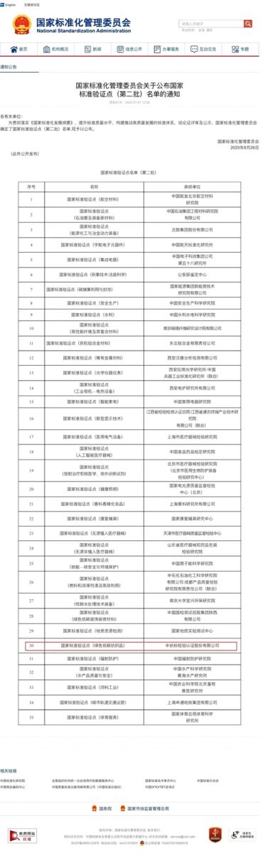 2025年6月26日,國家標準化管理委員會印發《國家標準化管理委員會關于公布國家標準驗證點(第二批)名單的通知》,正式公布包括通用技術中紡標檢驗認證股份有限公司在內的第二批共計35家國家標準驗證點名單。